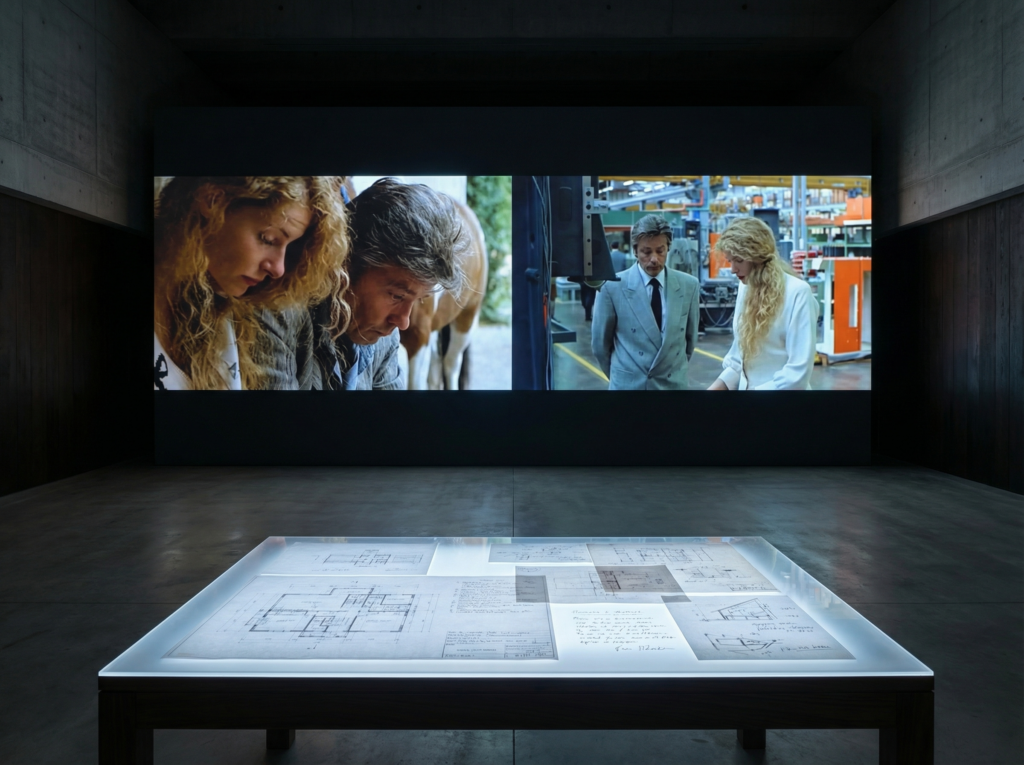 Cette œuvre propose une réinterprétation générative du film “Nouvelle Vague” (1990) de Jean-Luc Godard. Le dispositif utilise un algorithme de montage aléatoire qui présente simultanément deux extraits du film sous forme de diptyque.