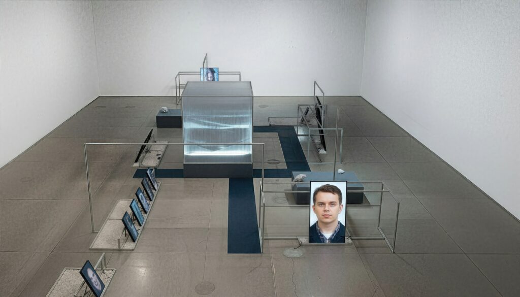Il est accompagné par une galerie de portraits représentant des dirigeants de la Silicon Valley et des géants technologiques : Elon Musk, Mark Zuckerberg, Jeff Bezos et d’autres encore. Ils ont été vieillis artificiellement. Ils pensaient devenir éternels grâce au progrès technologique et les voilà maintenant centenaires, incapables de parler, fixant le vide et rêvant de planètes inconnues, de cartes de navigation et de virus.