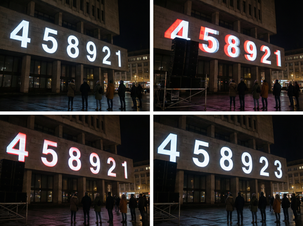Des chiffres défilent sur un bâtiment. Leur valeur croît ou décroît. Sans raison apparente, une alarme retentit, les chiffres clignotent, une voix de synthèse les lit, puis ils reprennent leur évolution.