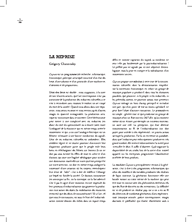 Capture est une solution à la crise des industries culturelles. Depuis des années, l’industrie musicale ne cesse d’annoncer sa disparition, les internautes téléchargeant illégalement des mp3. Capture est un groupe de musique si productif que personne ne peut tout écouter, lire ou voir. Il produit de nouvelles musiques, textes, images, vidéos et objets dérivés 24 heures sur 24 et 7 jours sur 7. Chaque fichier est unique et la série à laquelle il appartient est illimitée. Il est automatiquement traduit en d’autres formes et se multiplie en se transformant. Si un fichier mp3 est consulté sur Internet, alors il est effacé du serveur. Ainsi le « consommateur » devient le seul diffuseur possible. Capture diffuse de nouveaux messages et de nouvelles images sur Facebook et Twitter. On peut discuter avec lui sur le réseau. Un grande nombre de tâches sont automatisées que personne, ni les fans ni les auteurs, ne peut consulter en totalité. La machine dépasse par sa surproductivité toute espérance perceptive. En submergeant la consommation par l’usage de techniques génératives appliquées indifféremment au numérique et à l’analogique, Capture subverti l’idéologie consumériste et la relation entre les désirs et les objets.