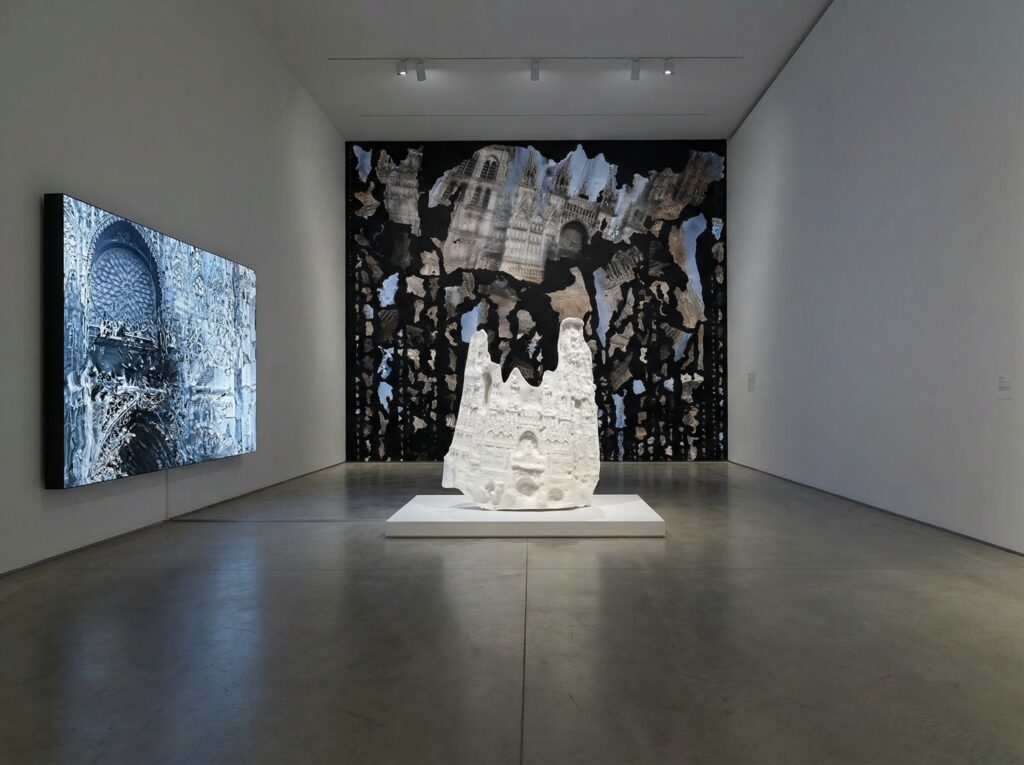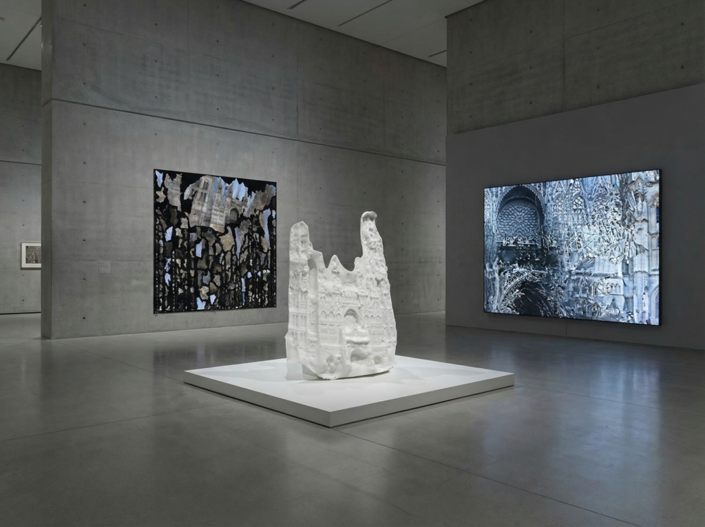 Le projet établit un dialogue avec la célèbre série des Cathédrales de Rouen de Claude Monet (1892-1894). Là où le peintre impressionniste explorait les variations atmosphériques et lumineuses d’un même sujet à travers des tableaux distincts, Chatonsky opère un renversement conceptuel en fusionnant toutes les perspectives dans une seule structure numérique.