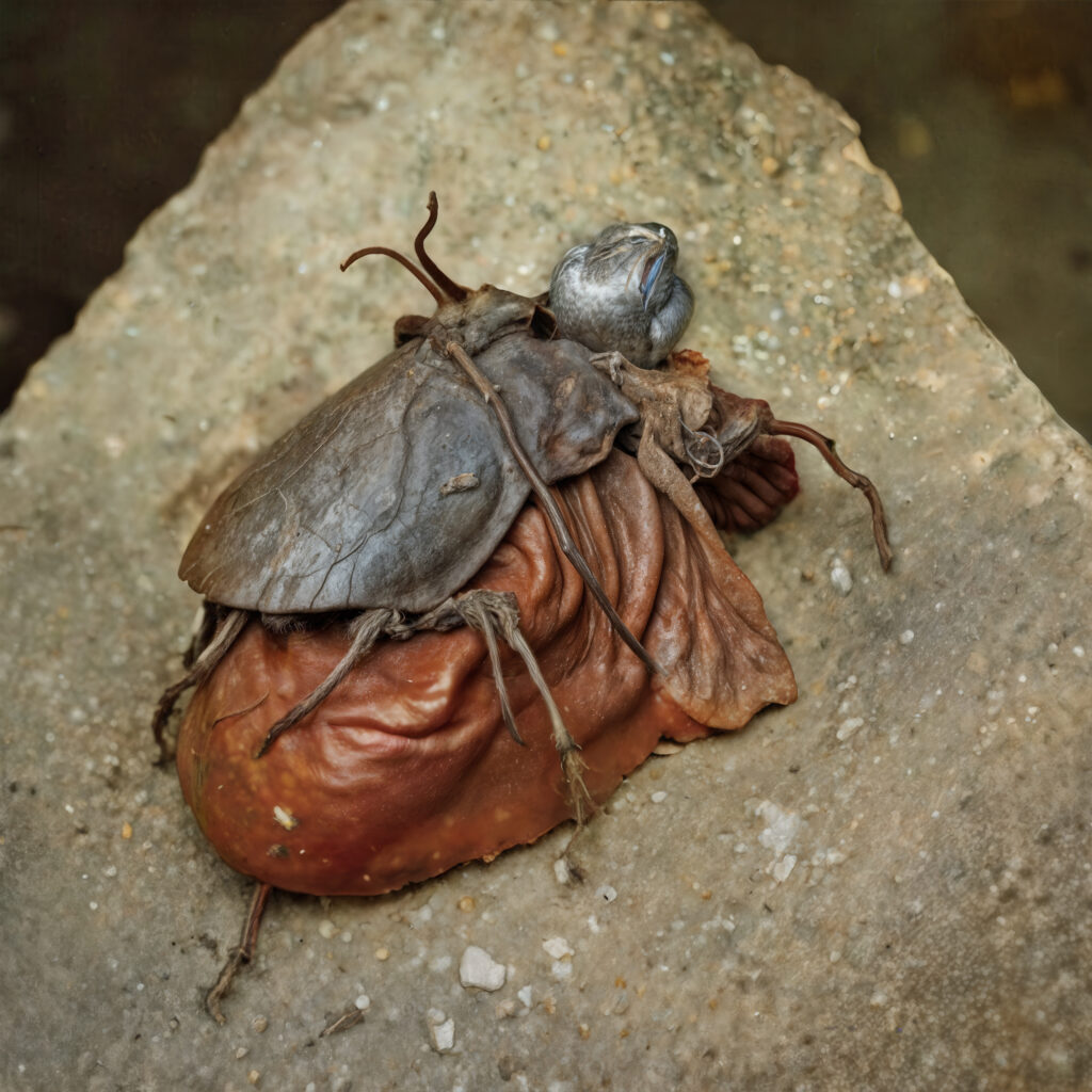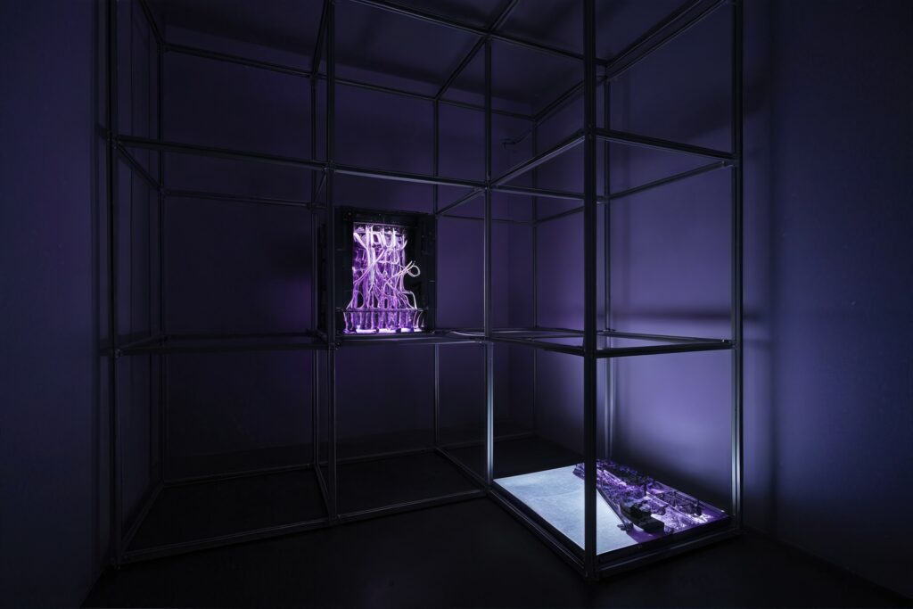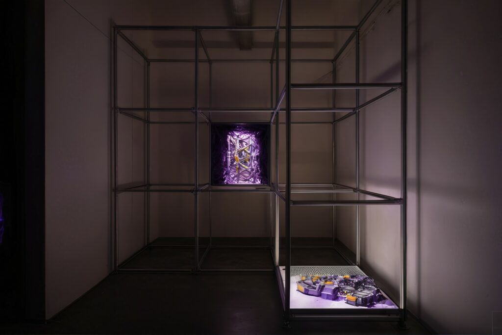 Le second écran est fixé dans la structure en aluminium et montre des images générées automatiquement à partir du recoupement statistique d’image-net. Les images sont des métamorphoses surréelles entre catégories ontologiques hétérogènes : plantes, animaux, techniques, minéraux, etc., semblant décrire un monde où les choses sont toujours instables, à la lisière de leur propre identité et mutent dans un flux continu. Elles sont réalistes sans être réelles.
