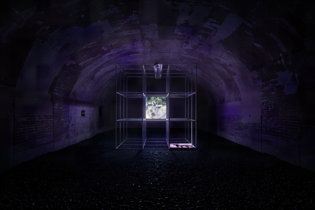 The installation is composed of two LED screens, a 3m3 modular aluminum structure and a sound source.