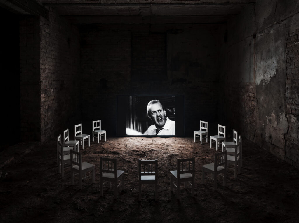 This interactive installation offers a reinterpretation of Sidney Lumet’s film “12 Angry Men” (1957). The installation transposes the cinematic space of the closed courtroom into the physical space of the exhibition through eleven chairs arranged in the room.