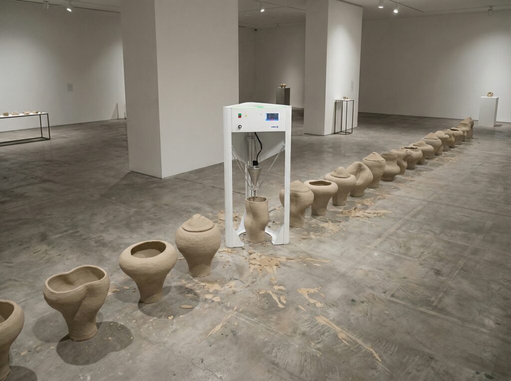 On produit, grâce à un réseau de neurones, une infinité de variations autour de cette forme qu’on imprime en argile teint avec des minéraux d’AlUla. Le colombage et la viscosité de la matière suggère un autre écroulement qui ne serait pas le fruit de l’érosion mais de la superposition des couches d’argile,c’est-à-dire d’une construction.