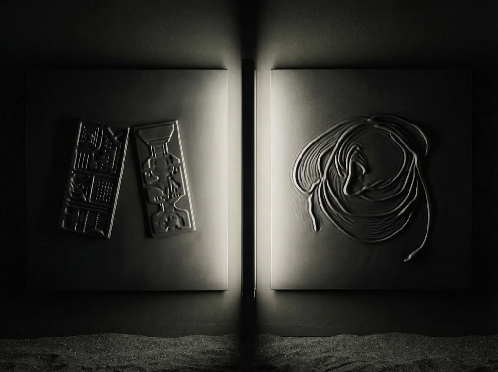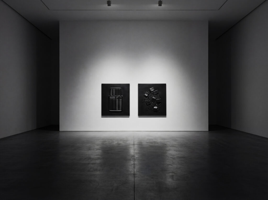 Ces tableaux sont des empreintes d’objets manufacturés. Emprisonnés sous une couche noire, ces objets sont figés pour l’éternité à la manière de fossiles pris dans une matière obscure qui pourrait faire penser à du pétrole.