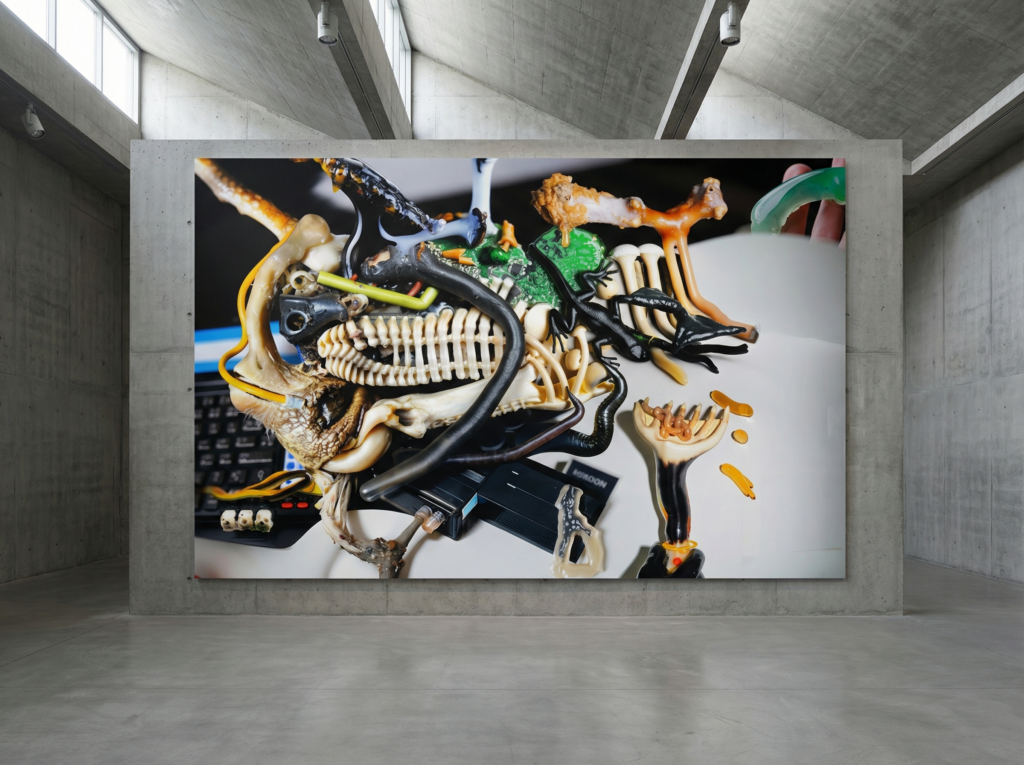 Laocoon VI 09/2022 Artificial imagination, Selected Artworks, Extinction, Photo https://transbordeur.ch/ metamorphosis components keyboard bones stablediffusion postlife aftertechnology afternature macro stones cables dalle2 logistique infrastructure culture nature landscape extinction skin