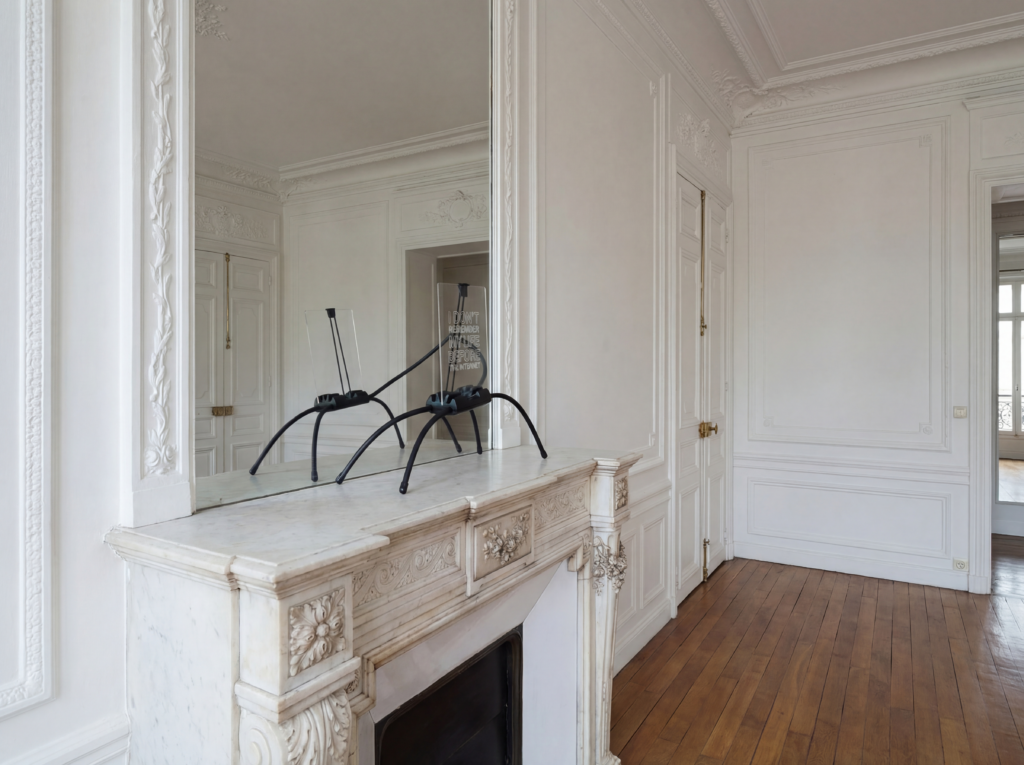 Gregory Chatonsky has imagined a space of recollection, in which stand fragments of skin obscured by time (3), a woman’s body lying on a cloth taking the form of a dysfunctional table (2), a carpet on which appears the shadow of an irradiated body (4), and surfing on the Internet (5). On a fireplace stands an organism that seems to question the relationship between its personal memory and the Internet (6).