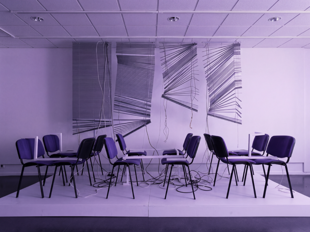 90cm x 450 cm. Moulages en plâtre, chaises de bureau, néons gélatinés (violet-magenta), store vertical, tiges filetées, fils de périphériques informatiques.