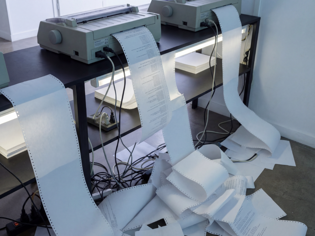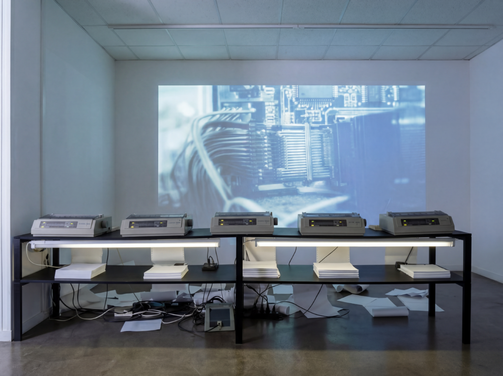 Des imprimantes matricielles obsolètes ne cessent de déverser des textes générés automatiquement: des paroles, des biographies imaginaires et des critiques. Une projection montre une usine de textile et les cartes perforées qui sont à l’origine de l’informatique.