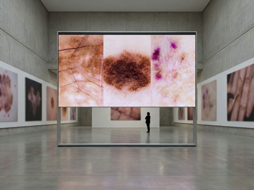 Second Skin 03/2020 Artificial imagination, Hyperproduction, Video Un dataset médical servant à détecter les cancers de la peau permet de générer de nouvelles formes inconnues et possibles. A medical dataset used to detect skin cancers can generate new unknown and possible forms.