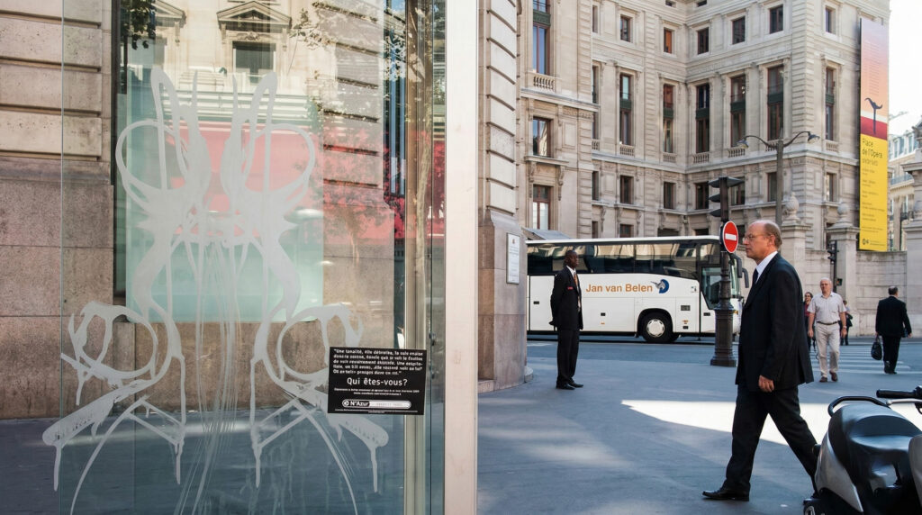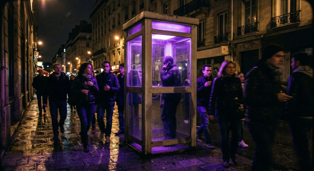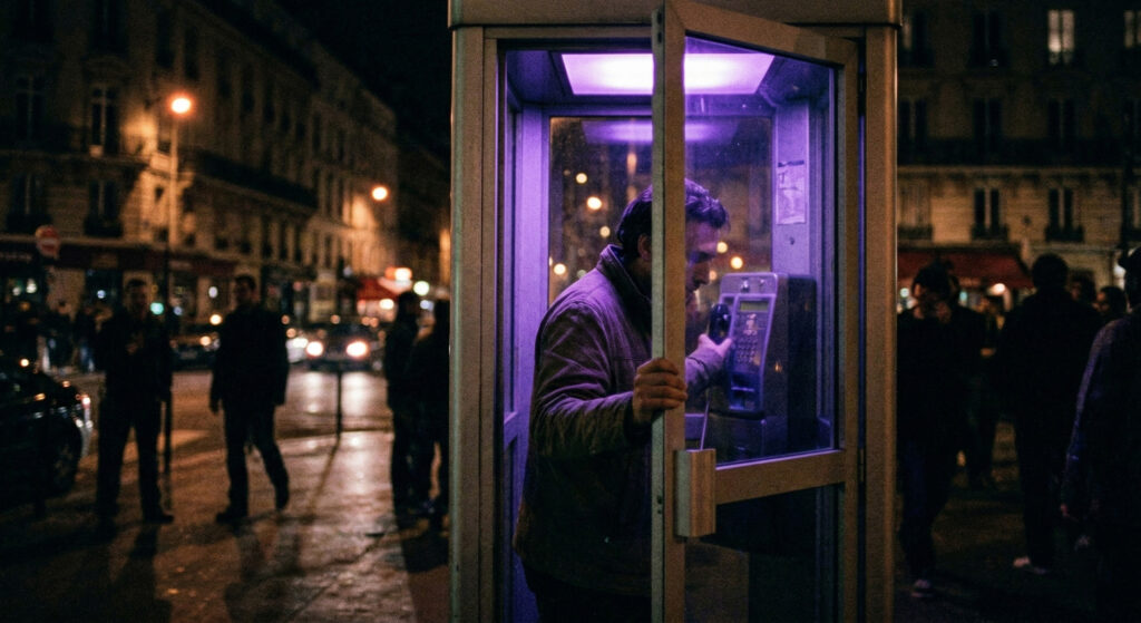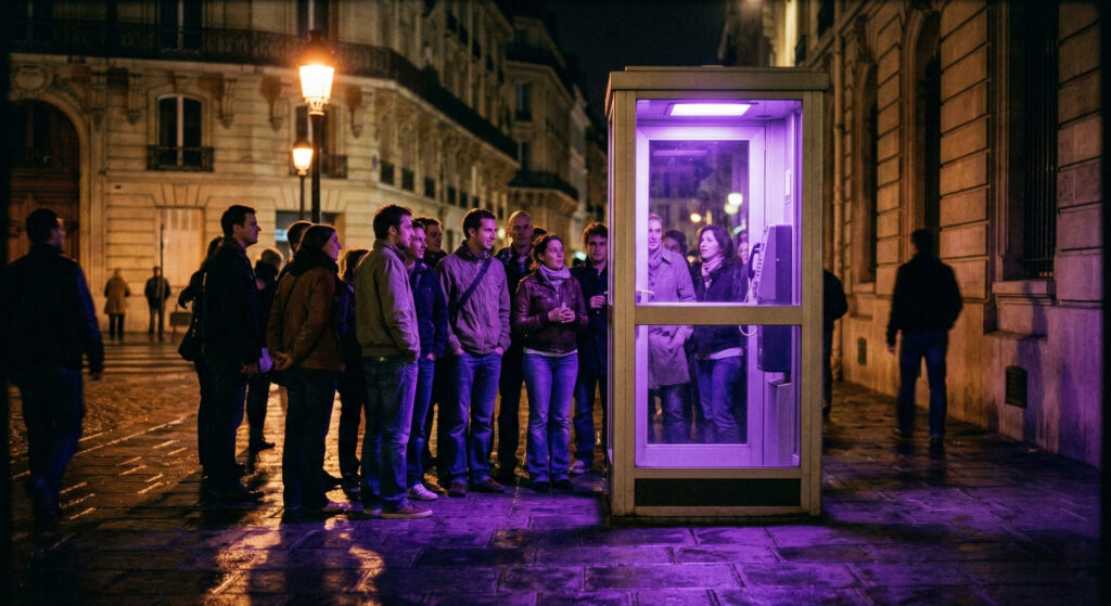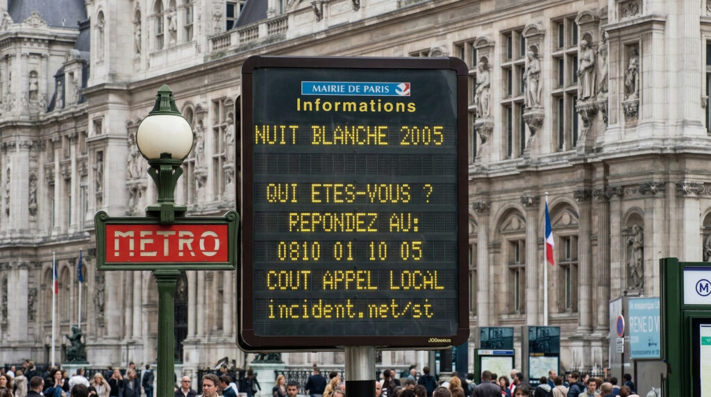 During many months, fragments of a fiction are displayed on Paris’s billboards and telephone booths. Passer-by are invited to answer on the phone the question: “Who are you?”. During the sleepless night, about fifty modified telephone booth flash on and off when their number is dialed. A call center situated at the city town hall automatically dials the numbers: the passer-by opens the door, pick-up the phone and hears the voice of someone uttering his own name, telling his life story, an anecdote or describing himself. After that, a new voice asks: “Who are you?”. At this point, the person in the cabine can leave a message while his voice, mixed to movie clips from the 70s dealing with telephone conspiracies, is transmitted and played in the official building.