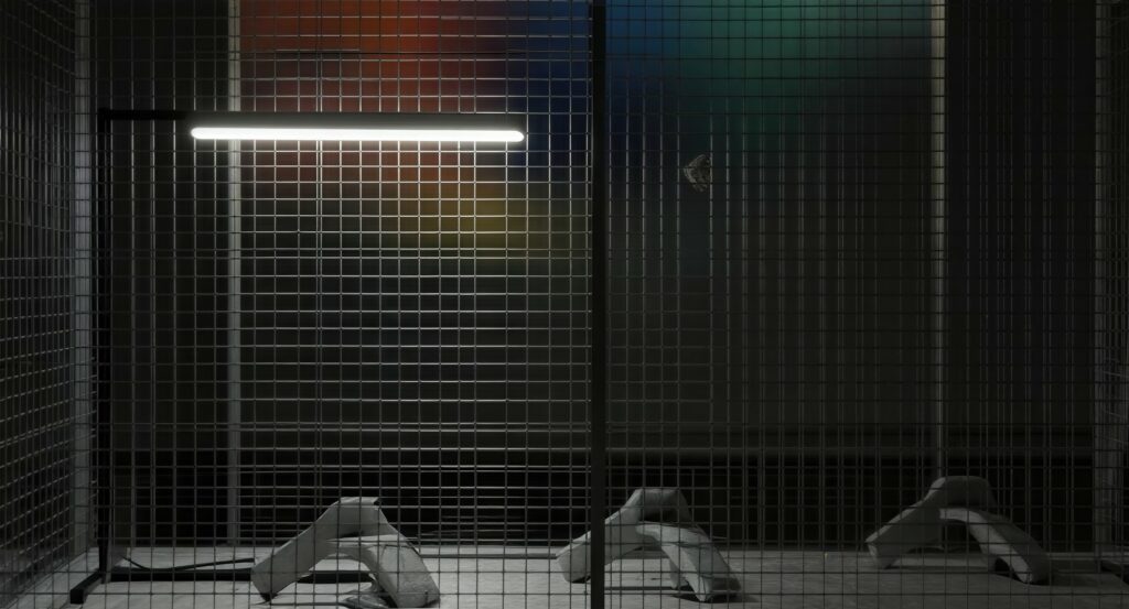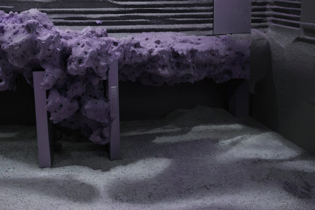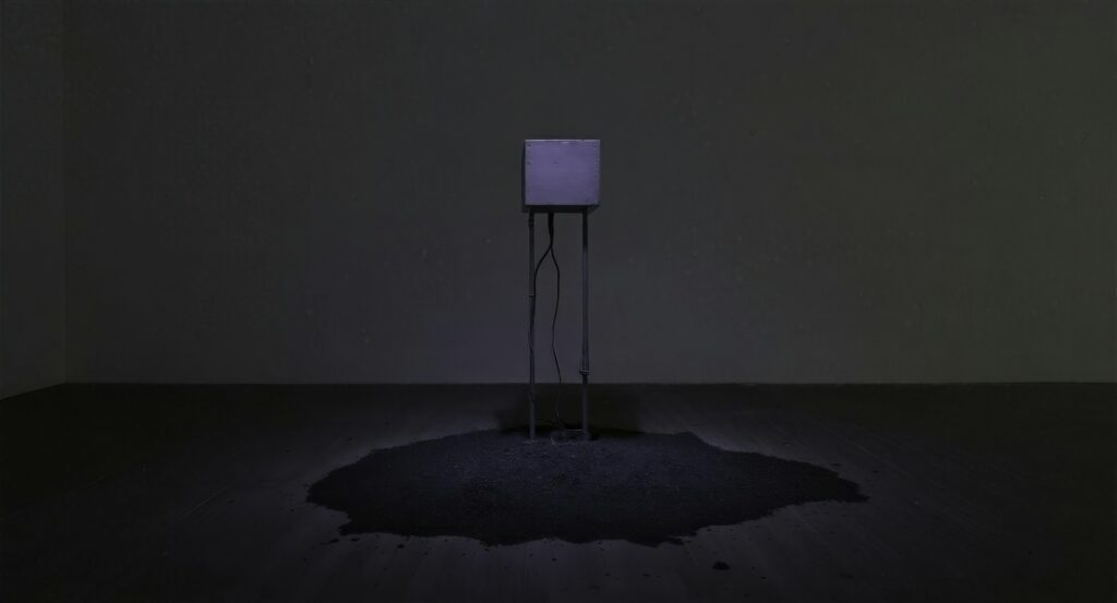 Le dispositif révèle un environnement hybride, à la fois technique et organique, qui persiste à fonctionner en l’absence de toute présence humaine. Nos objets industriels et nos déchets contemporains y sont exposés comme autant de fossiles – traces archéologiques permettant à ces futurs découvreurs d’imaginer, par déduction, ce que nous avons été.