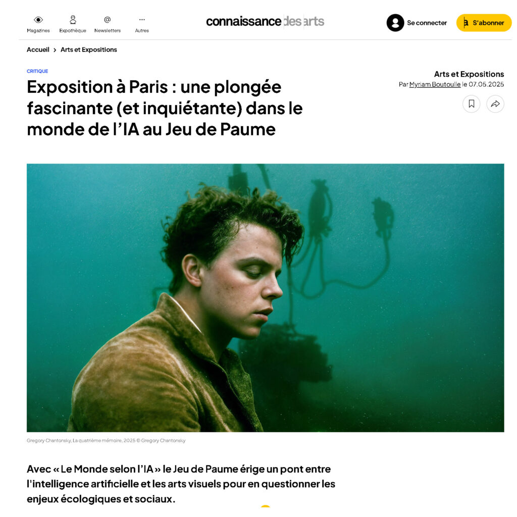 Une plongée fascinante (et inquiétante) dans le monde de l’IA au Jeu de Paume 05/2025 Press https://www.connaissancedesarts.com/arts-expositions/exposition-a-paris-une-plongee-fascinante-et-inquietante-dans-le-monde-de-lia-au-jeu-de-paume-11201420 4memoire