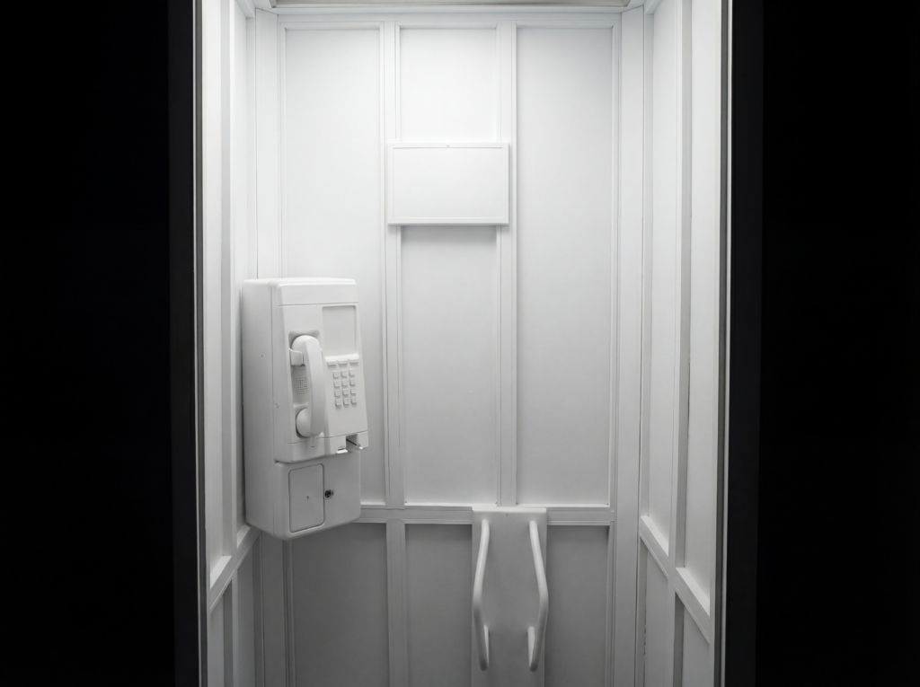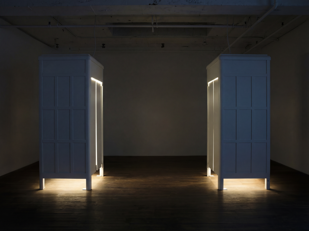 Cette installation se compose de deux cabines téléphoniques blanches et opaques disposées face à face, créant un espace d’intimité isolé au sein de l’environnement d’exposition. Le dispositif invite le visiteur à une expérience d’écoute singulière.