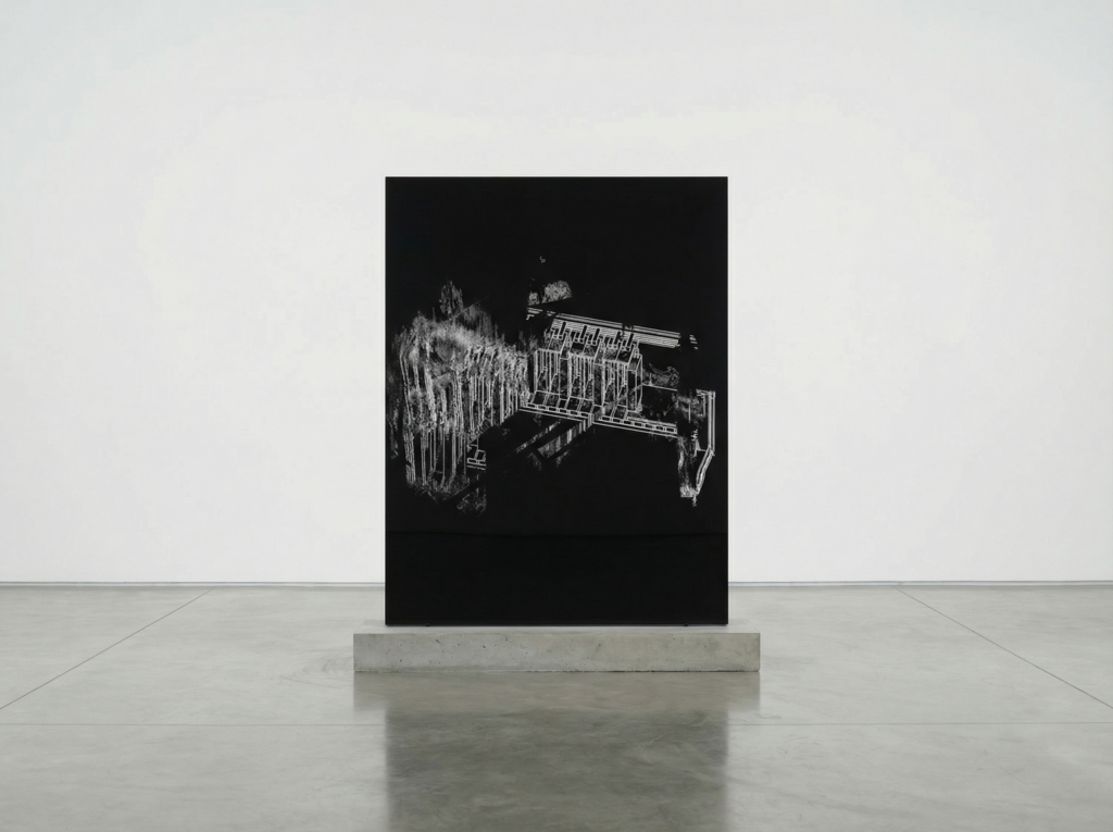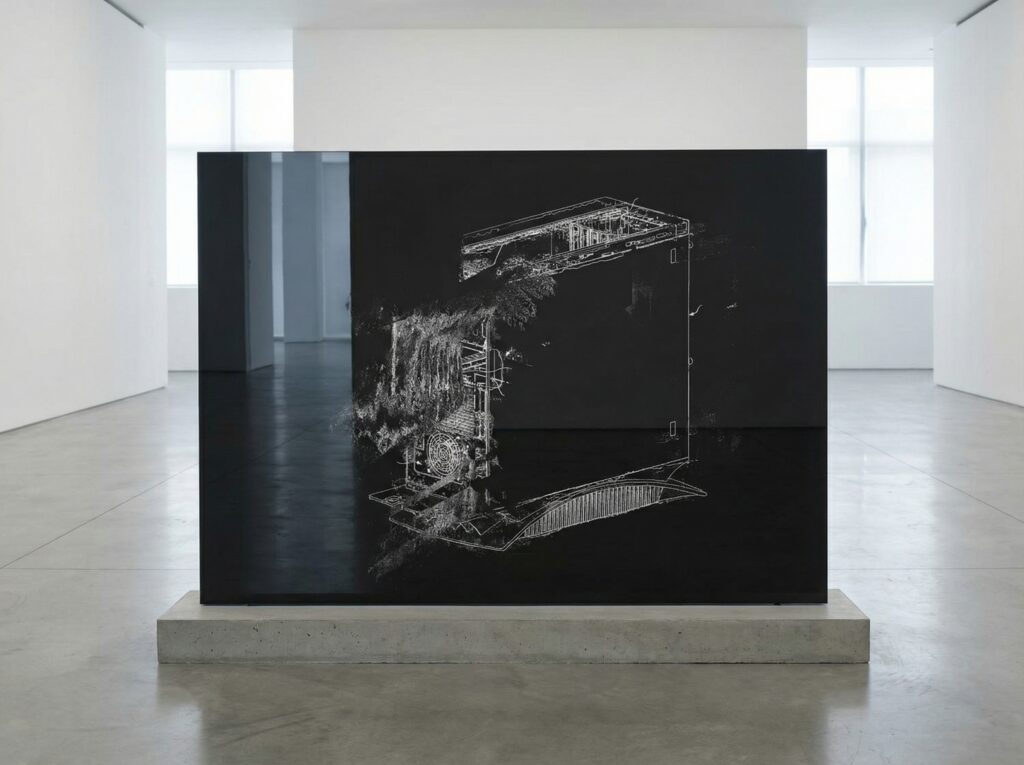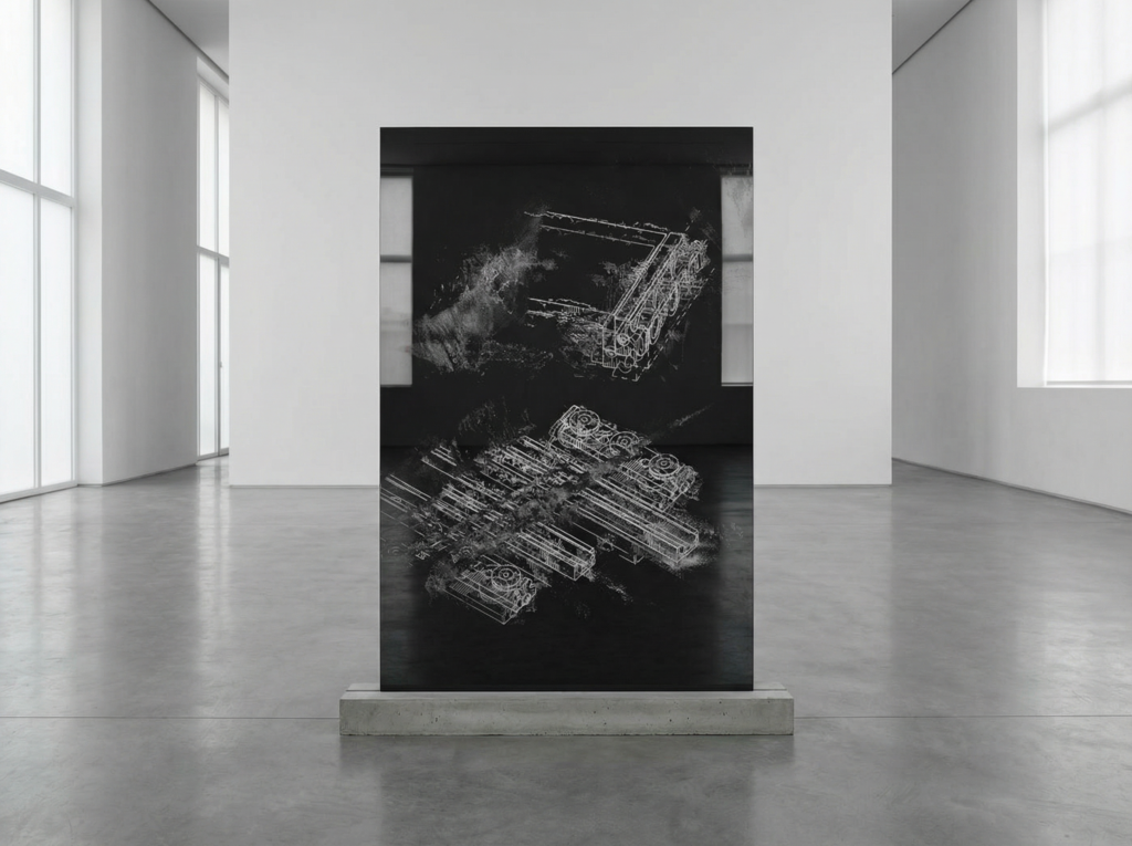 Une machine va chercher sur le Web des images de brevets de serveurs. Elle les superpose, les déforme les unes par rapport aux autres, créant de nouvelles images de machines altérées grâce à un réseau récursif de neurones, se déversant les unes sur les autres à la manière de torrents. Ces images sont gravées sur du miroir noir.
