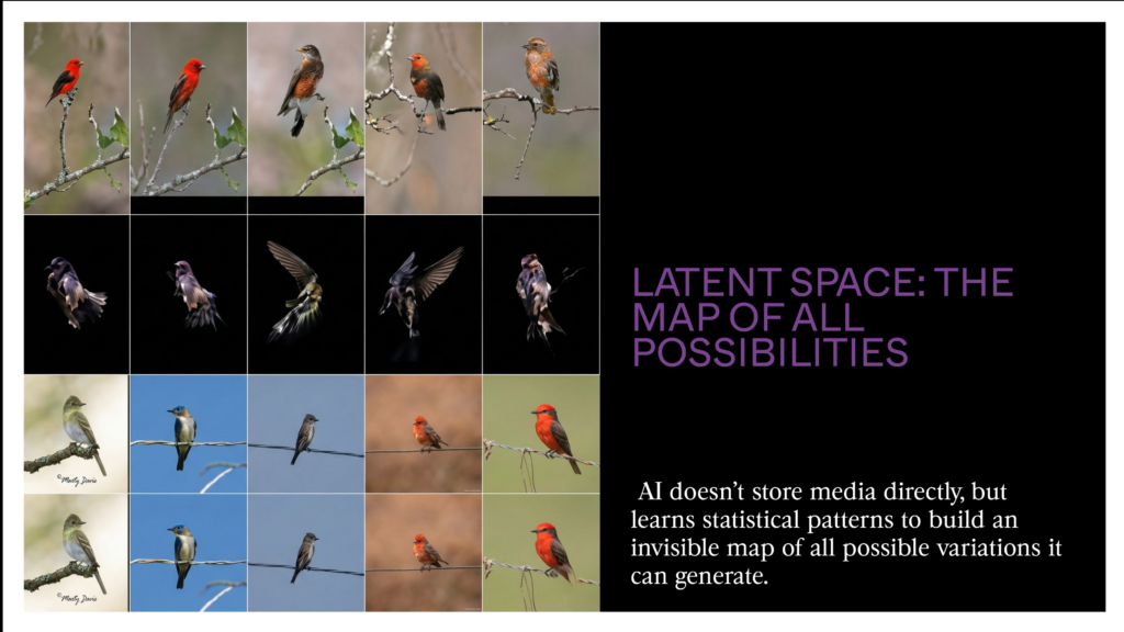 In this space, there are no photos, videos, or sounds, no discrete medias — only vectors that make it possible to produce documents that don’t exist but feel real for us. Suppose we show 5,000 images of birds to AI. It doesn’t store images one by one.