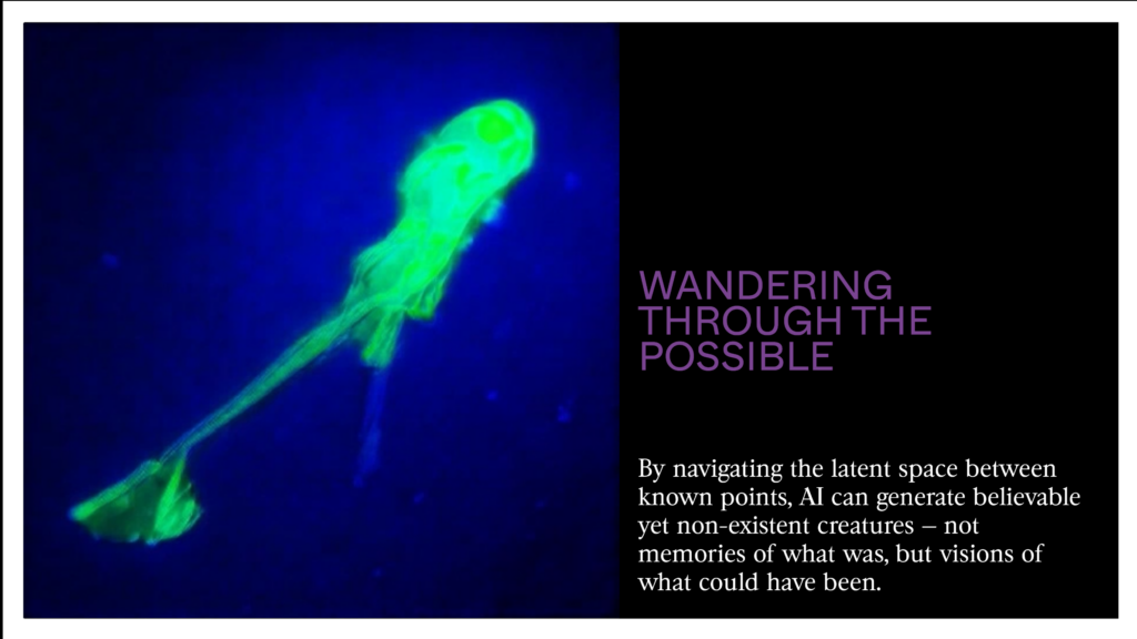 When I drift through this latent space, I wander between these positions. I can ask: what lies halfway between a flamingo and a crow? The machine doesn’t search its memory — it calculates a middle position on its map and generates the bird that lives there. This bird has never existed. But it is believable, coherent, possible. That is the memory of the possible: not what has been, but everything that could’ve been if nature had taken a different path.