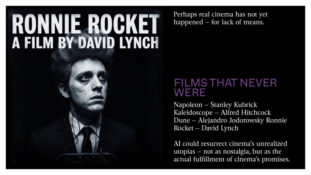 Today, AI doesn’t merely simulate the grain of film or the flow of motion; it brings back a cinema that has long stayed like a ghost — an unrealized cinema stuck inside the limits of chemical film recording. The Surrealists wanted to bypass the conscious mind to reach something deeper. AI does the same thing, but with statistics. It isn’t the extension of the camera but the bringing back to life of all the films that could’ve been — that ‘cinema of the unreal’ Epstein called for when he saw in slow motion or the reversal of time a break with human reason.