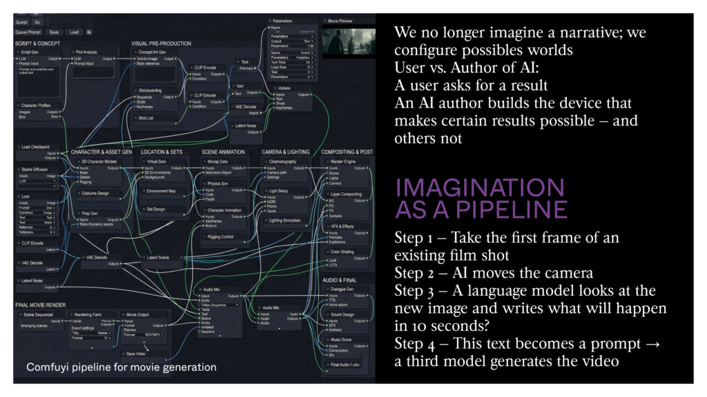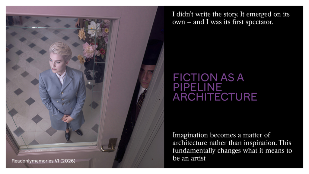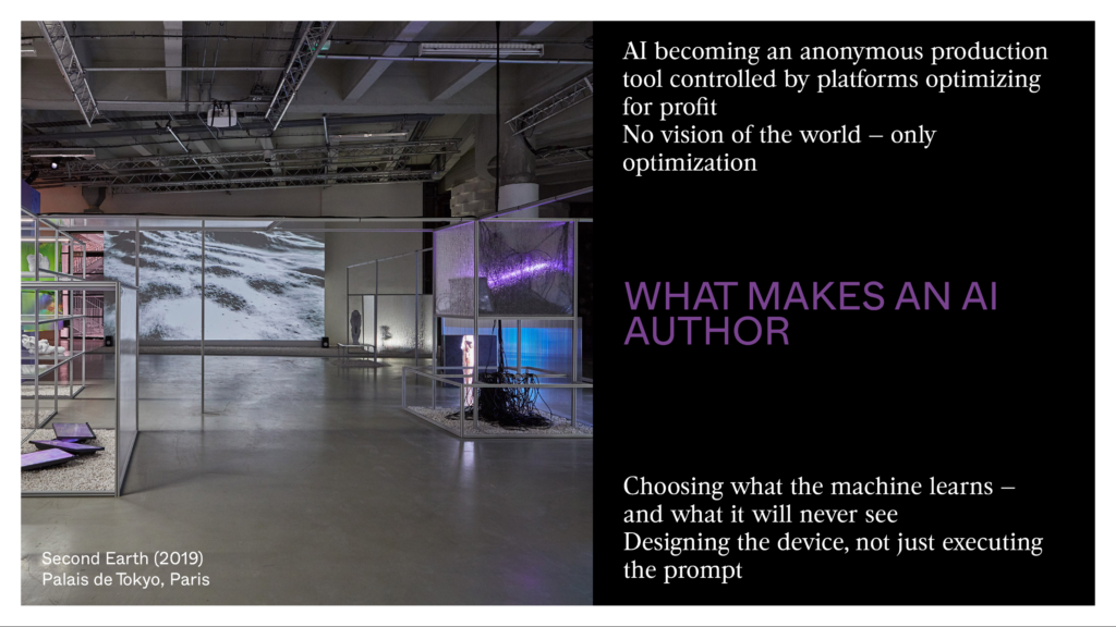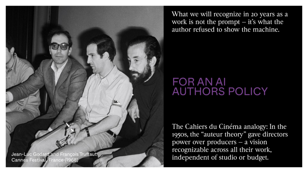 In the fifties, the critics at Cahiers du Cinéma invented a simple but powerful idea: behind a film there’s an author — the director — and this author has a vision that can be seen from film to film, no matter the studio, the budget. This idea gave power to filmmakers over producers. Today, the danger is that AI becomes the opposite: an anonymous, standard production tool run by platforms that have no view of the world other than profit. An AI author isn’t someone who writes good prompts — anyone can learn to do that. It’s someone who chooses what the machine learns, what it’ll never see, in what context it works. That’s what will be recognized, in twenty years, as a body of work — not the prompt, but what the artist refused to show to the machine.