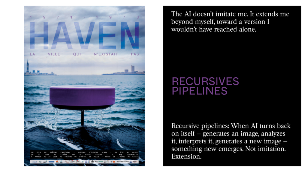 Technical pipelines change our imagination when they’re recursive — when they turn back on themselves: an AI creates an image and studies it to build its own reading and produce a new image. The fact that the result looks like what I’d have wanted to do without having done it is perhaps the most unsettling proof: AI doesn’t copy me — it extends me beyond myself.