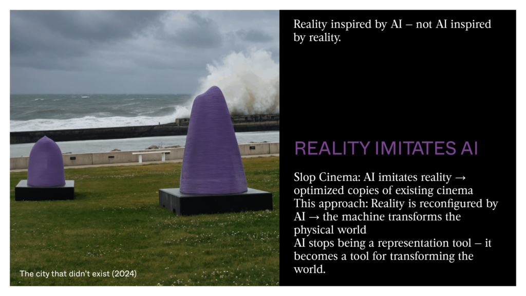 I was inspired by this film to create sculptures of several tons that were 3D-printed in concrete and placed all over the city of Le Havre. Human imagination isn’t always the starting point. Sometimes it continues something that wasn’t entirely human. In slop cinema, AI draws inspiration from reality. I try to do the opposite: to have reality draw inspiration from AI. This shift — from the generated image to concrete of several tons — turns the logic of slop cinema upside down. Reality no longer feeds the machine; the machine reshapes the real. AI is not a tool of representation but becomes a tool for changing the physical world.