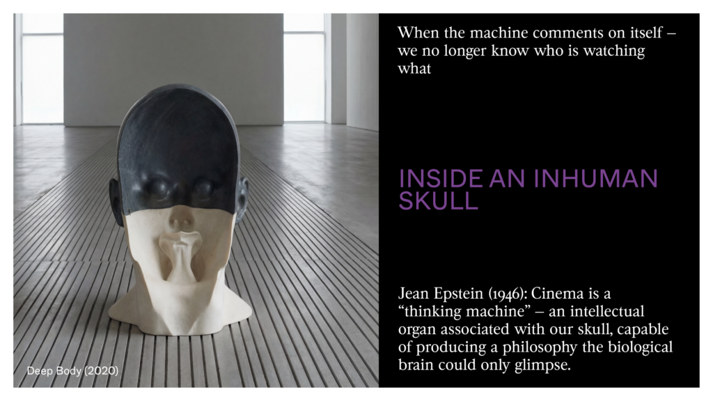 What I mean is that if humanity were to disappear, these neural networks could keep generating fictions, faces, and landscapes, endlessly looking at all the combinations of what we could’ve been. AI is the monument to our possible absence — our final tomb, a living archive that doesn’t preserve the past but makes it grow and spread into a future with no witness. In this ‘inhuman skull,’ cinema is no longer an art of light, but a science of what stays, in which every image would be the sign that our imagination has learned to do without us.
