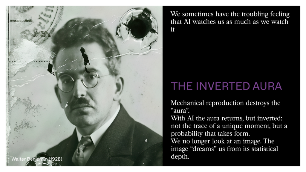 It is here that a brand new thing appears: the return of the ‘aura,’ but an inverted aura. Walter Benjamin saw in mechanical copying the end of the unity of the work. AI constantly generates the unique, and in this movement one sometimes has the feeling that it watches us as much as we watch it. Something in this inhuman skull made of silicon and vectors seems suddenly to fix its gaze on us. It isn’t the gaze of an actor captured fifty years ago; it’s the gaze of a probability taking form. We’re no longer looking at an image — it’s the image that ‘dreams us’.