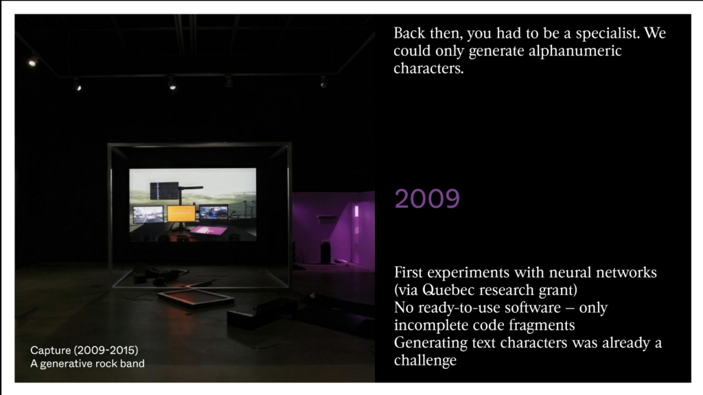 I’ve been using AI — that is, neural networks — since 2009. I was able to start early thanks to a research grant from Quebec when I was a professor in Montreal. At that time, there was no ready-to-use software, only fragments of code. You really had to be a specialist in computer science to get any result. We could only generate alphanumeric characters.