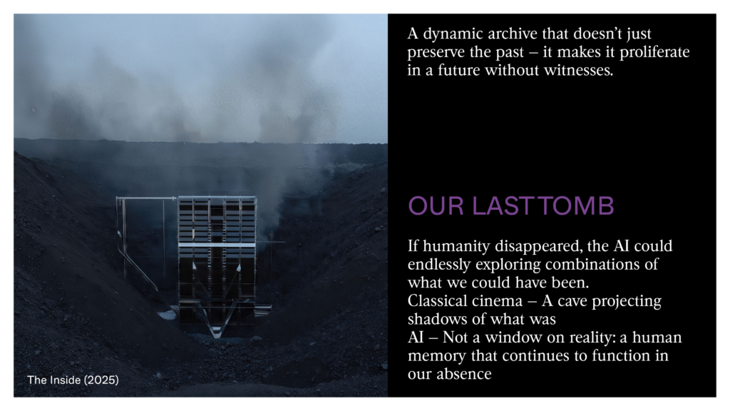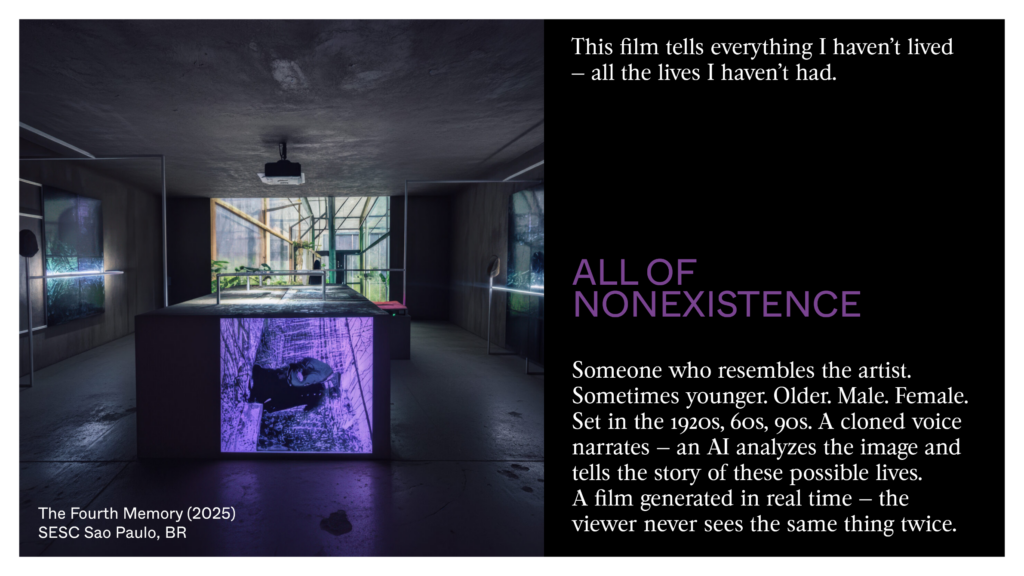 With the installation “The Fourth Memory” I created my own tomb when I’m still alive. It takes the form of a sculpture where my body is carved, with various photos on the walls showing data centers on a planet left behind by human beings. We see a film generated in real time: the viewer will never see the same thing twice. The moment they’re watching is unique and erases itself as it is created. The viewer becomes its only memory. We see someone who looks like me — sometimes younger, older, sometimes male, female, sometimes white or Black, sometimes placed in the 1920s, the 1960s, or the 1990s. This film tells the story of everything I haven’t lived, all the lives I haven’t lived. It isn’t a egocentric monument to my real life, but to my possible lives, to what looks like me but isn’t me. We listen my cloned voice: an AI studies the image and tries to tell the story of these lives. This film isn’t a film, because it has no end. It is always similar but never repeats itself. We exit the historical loop in which the twentieth century had trapped us.