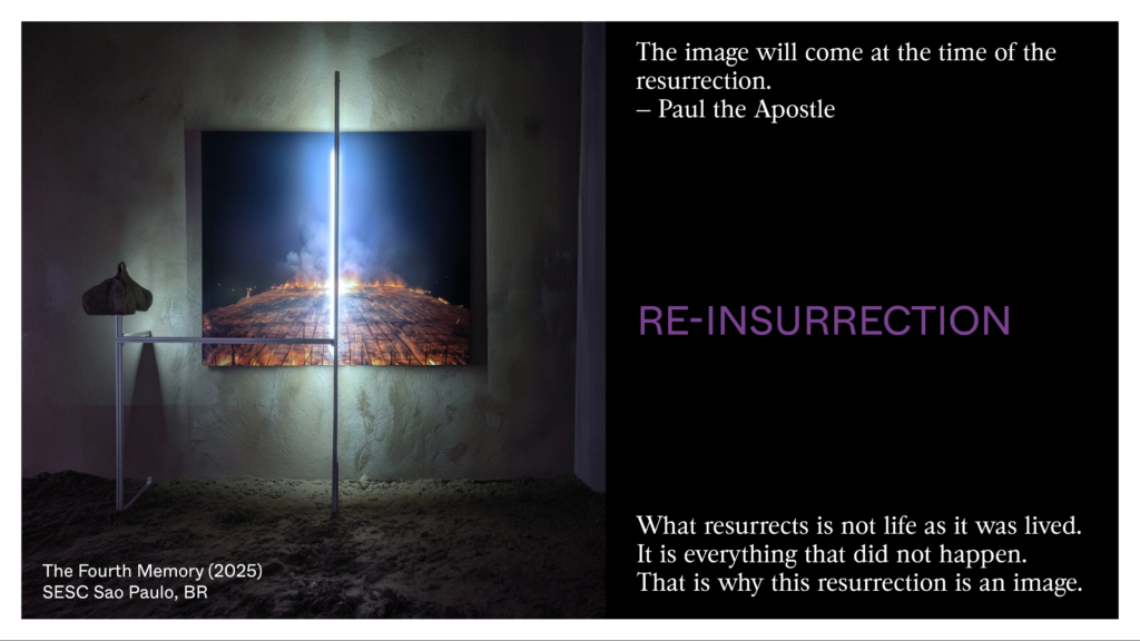 The fourth memory is AI, which takes in all these physical memories to create new memories that have never taken place but look like them. AI is a memory that looks like us and keeps going — but without us. It’s the memory of everything that hasn’t existed, of all the possible.