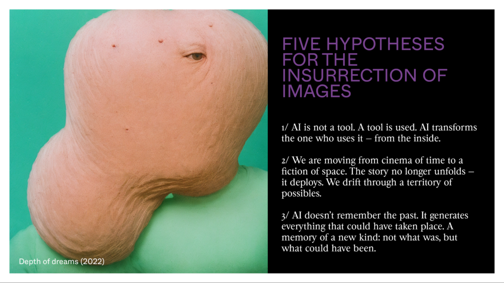Several of us in France and elsewhere believe in the rise of a new era of images. Several of us believe that film storytelling is exhausted. Because, it always tells the same story: the strip of film passing through the projector. A time that turns into destiny for human beings. A time that always unfolds in the same way — and that traps us. With AI, we can move from fiction in time to fiction in space — to drift through a latent space of the possible, where several realities exist at once.