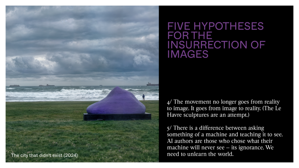 The natural landscape is being changed by this AI, and we’re in the process of building at the top of this hill a production and post-production stage for this new cinema. We’re also working with Ida Soulard to create a school to help this new generation of AI authors to emerge. These new authors won’t only need to master these technologies to bring their ideas to life — their imaginations will also need to be changed by the pipelines of these AIs. These authors will have to see AI not as a means but as a medium for the uprising of images over reality. They won’t be prompt technicians but explorers of the latent future. They’ll have to be able to work with AI as if they could listen the difference between their own voice as it rings inside their skull through their bones, and their voice as others listen it. They’ll have to be able to imagine together something that doesn’t yet exist — as we’ve done together during this talk, making each one of us one of these authors of a new kind.