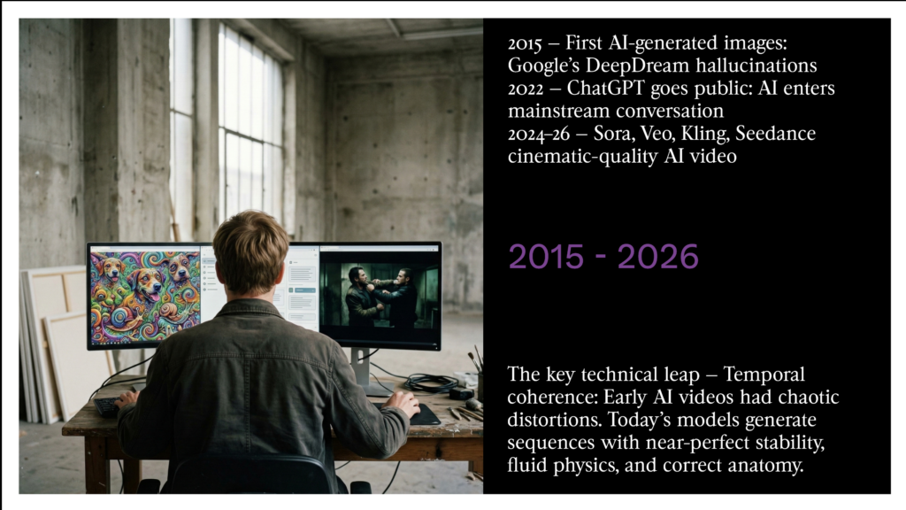 Between 2024 and 2026, AI went from being a “glitchy” curiosity to a film production engine that frightens the Hollywood industry. This shift happened around time consistency: where the earliest videos had chaotic distortions, current models like Sora, Veo, Kling, and Seedance generate sequences of stunning stability.