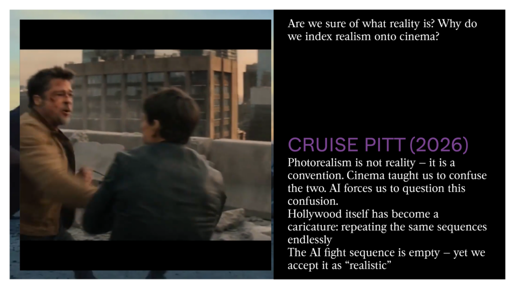 We’ve all seen that sequence between Tom Cruise and Brad Pitt. It’s so realistic! But are we sure about what reality is? Why do we link realism to cinema? And if we keep watching this fight again and again, what do we see? Two aging actors fighting, again and again? Is it an accident that Hollywood cinema in general has become its own copy, repeating the same empty sequences over and over, much as an AI would? Cinema without AI looks more and more like AI-generated cinema.