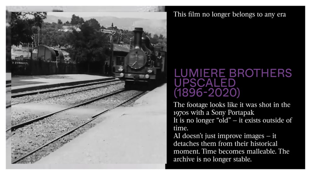 Now, when we watch this upscaled sequence by the Lumière Brothers. We have a strange feeling watching this old sequence. It no longer belongs to any era. It almost looks like a video shot in the 1970s with a Sony Portapak.