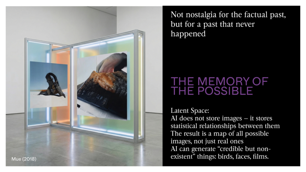 Third idea: AI doesn’t remember the past. It generates everything that could’ve taken place. It’s a memory of a new kind — not what has been, but what could’ve been.