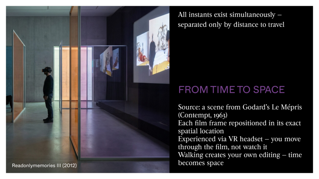 By moving, you can create your own editing. All moments exist at the same time — only separated by a distance to cover. It’s this drift through space that creates time here. You understand that cinema time was only a spatial convention in disguise. By making all moments of a film exist at once, space shows that the step-by-step story was a choice — not a necessity. And that AI could invent other ways.