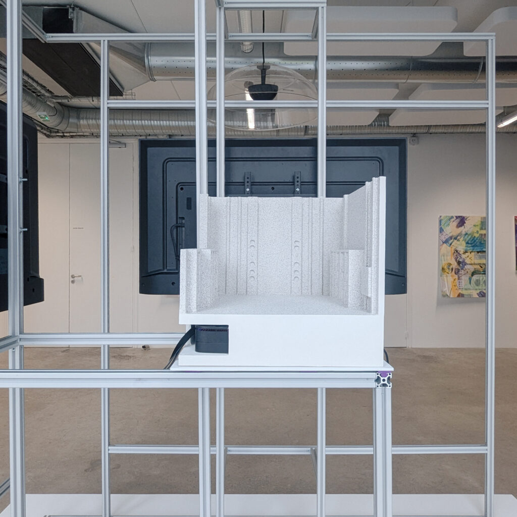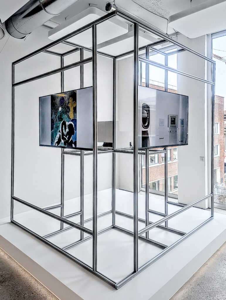 Cette installation met en dialogue deux paradigmes : le “cube blanc” du lieu d’exposition et la “boîte noire” de l’intelligence artificielle.
