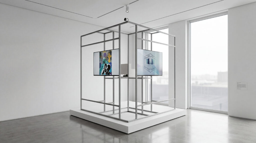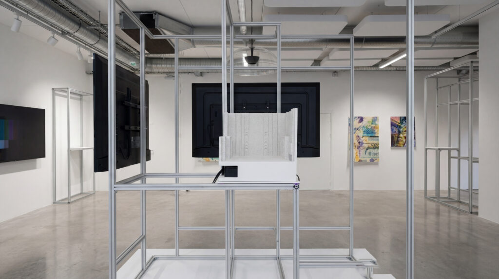 Cette installation met en dialogue deux paradigmes : le “cube blanc” du lieu d’exposition et la “boîte noire” de l’intelligence artificielle.
