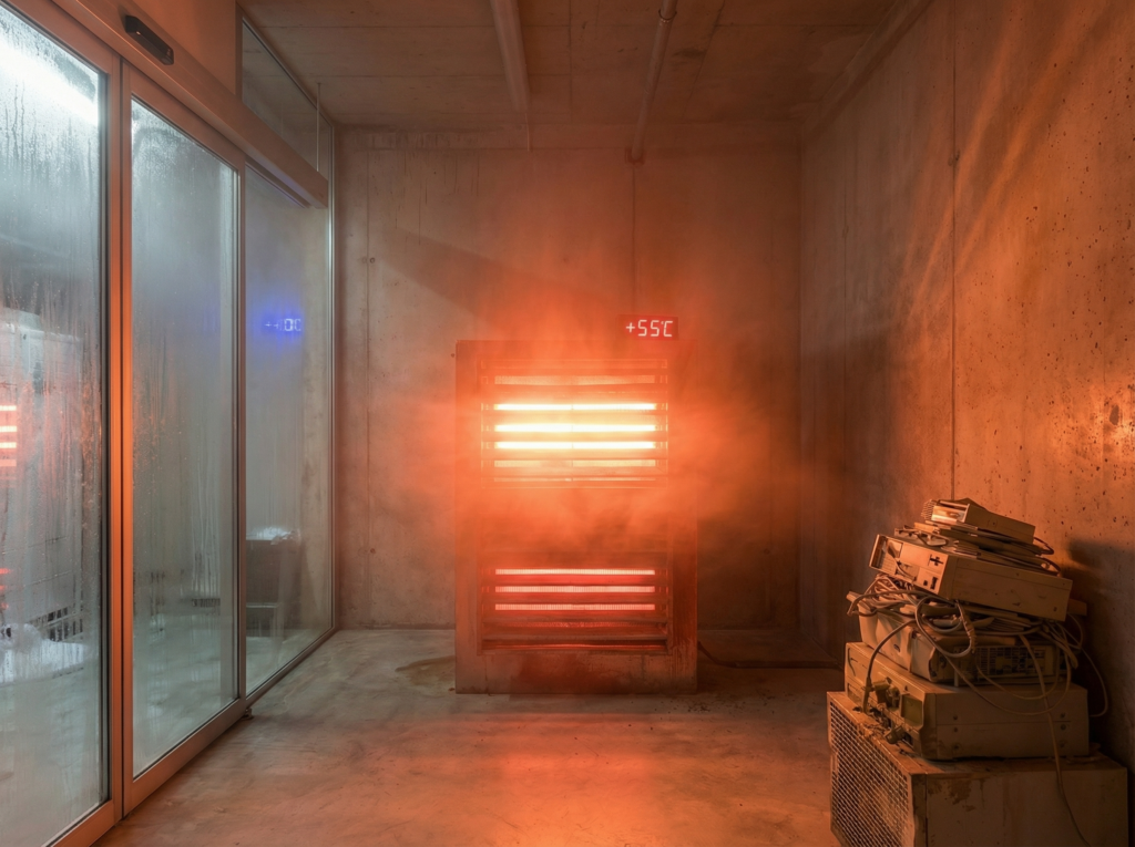 The installation is divided into two separate spaces. In the first room, air conditioners produce intense cold as well as various peripheral phenomena: noise, liquid, etc.. We pass an automatic double door that isolates the two rooms. In the second room, we see the other part of the air conditioners that produce heat. The atmosphere becomes suffocating.