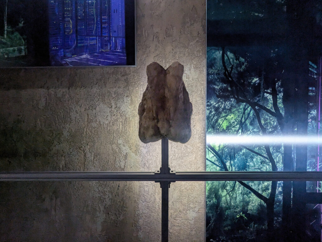 Outros questionamentos são levantados na mostra, como as possibilidades decoloniais de modelos de IA frente à dimensão colonial e dominante que as tecnologias carregam, e como elas são capazes de moldar uma forma de pensar e agir, introduzindo um novo tipo de hegemonia cultural. Dentro de uma intersecção com a história, algumas obras exploram os espaços latentes das memórias culturais propondo passados alternativos, utopias esquecidas e mídias imaginárias e possibilidades futuras que tangenciam questões como a própria existência humana.