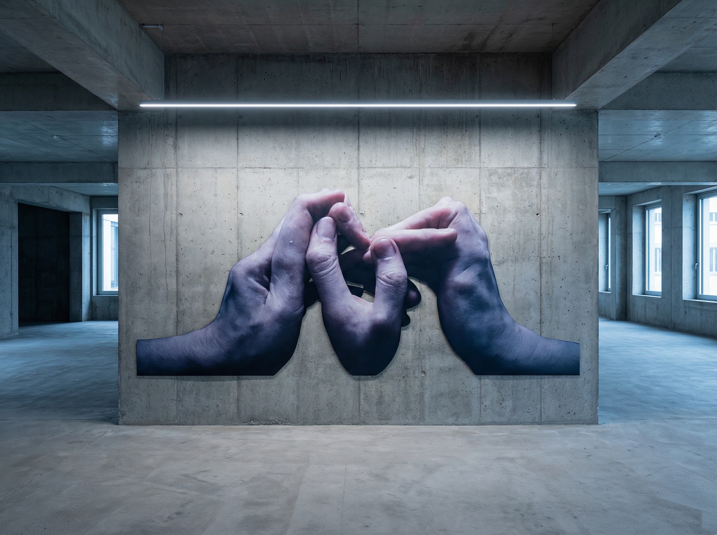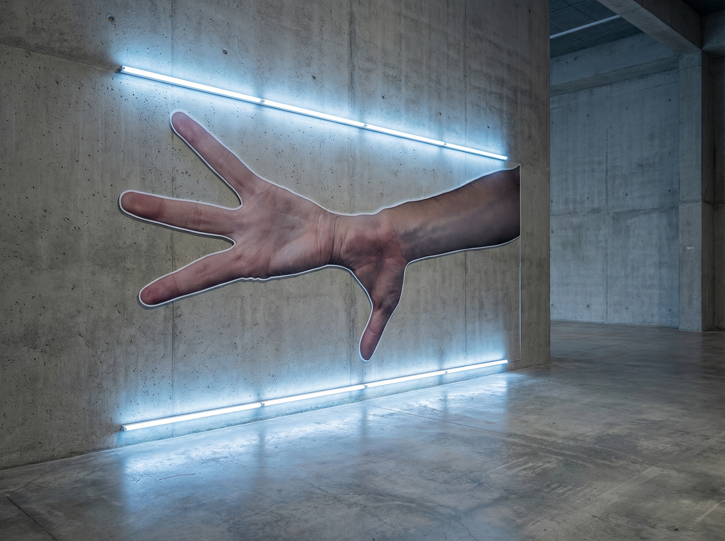 The artist trained an AI system to produce images of hands in various positions against monochromatic backgrounds, creating a study that is both anatomical and conceptual. The hands appear at times stretched, deformed, or multiplied, as if the algorithm were exploring the limits of bilateral symmetry and the functional asymmetry of these organs.