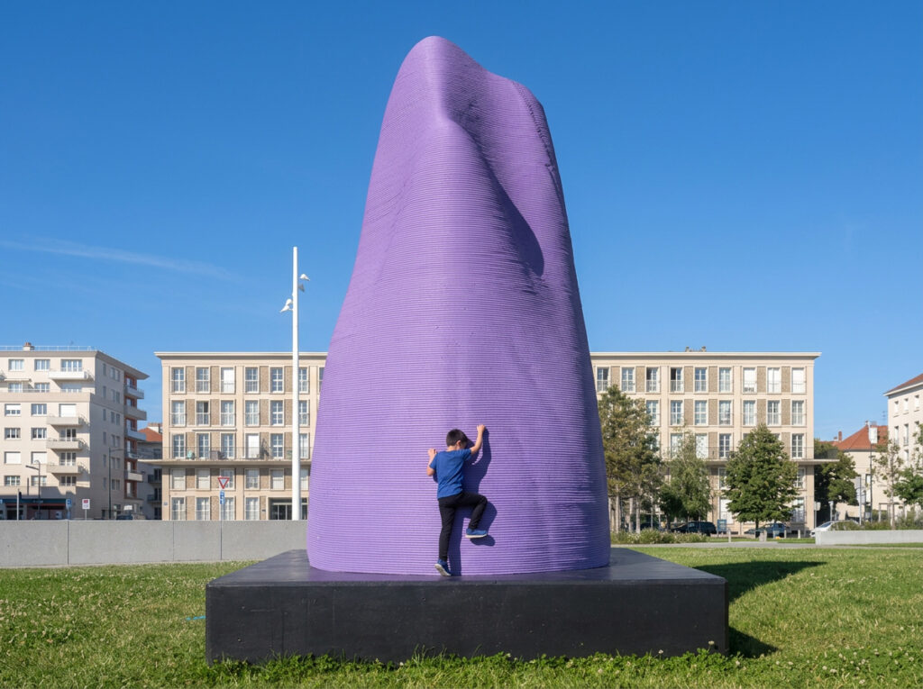 La ville résonne de ces narrations disséminées, où chaque fragment dévoile une parcelle d’intimité, un éclat d’existence. Les formes violettes, immobiles et silencieuses, deviennent les gardiennes de ces récits, les témoins muets d’une humanité en train de disparaître. Ainsi, se dessine un paysage intérieur, où chaque sculpture est à la fois mémoire et promesse, ancrée dans le béton, mais portée par la fluidité des vies qu’elle contient. Une autre réalité émerge, imprévisible, où le passé et le futur s’entrelacent dans un présent qui n’existe plus.