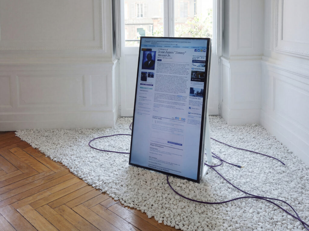 “Le jour de notre mort” est une enquête sur des personnes décédées récemment. À partir des traces laissées sur Internet, l’artiste essaye de reconstituer leurs vies passées. Il va d’une information à une autre information, effectue des recoupements et grâce à une voix de synthèse, il raconte leur vie. Le réseau devient le réceptacle de ceux qui ne sont pas encore nés et de ceux qui sont déjà morts.