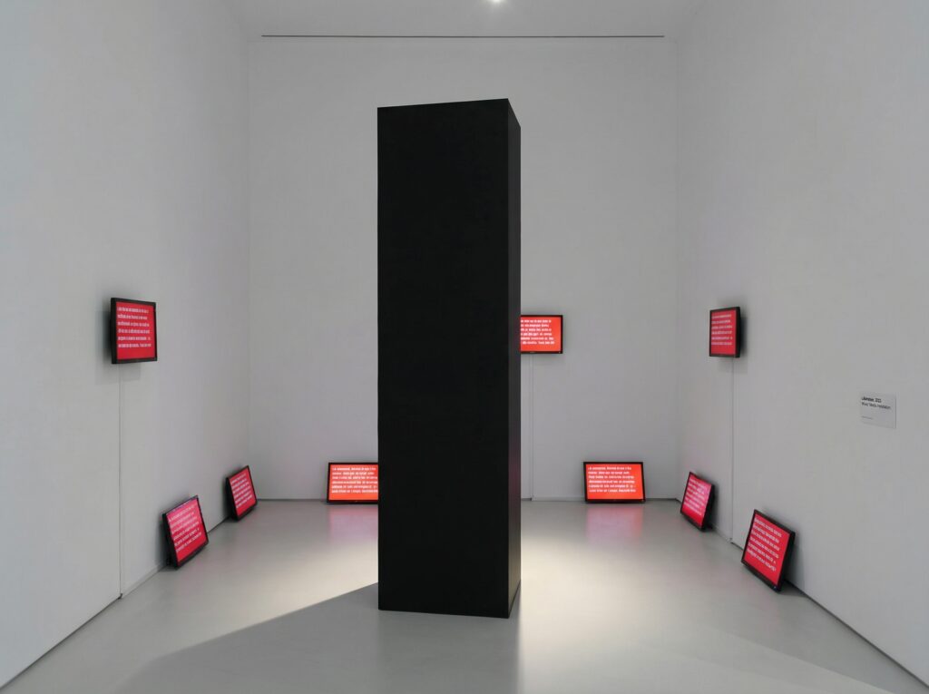 Liberation is a monolith of 2.5 meters and a series of red screens. We hear a voice in the monolith that pronounces all the time the comments from readers of a famous newspaper in France: Libération.
