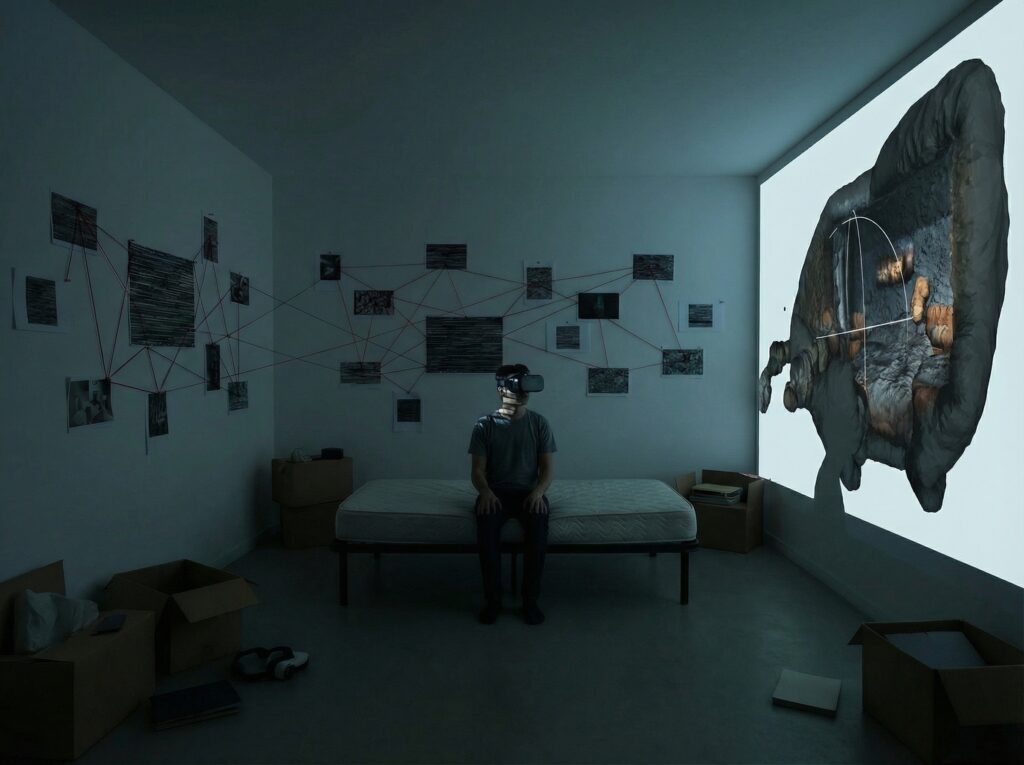 La mémoire d’un lieu, à présent déserté. Des gens ont vécu là. Nous ne connaissons pas leur histoire, nous voyons seulement des traces. Les lieux sont devenus des organes dans lesquels on peut entrer et se déplacer. Leur texture est étendue sur des tissus imprimés, comme si toute leur mémoire pouvait être contenue là. Ce sont les archives d’un événement qui n’a pas eu lieu.