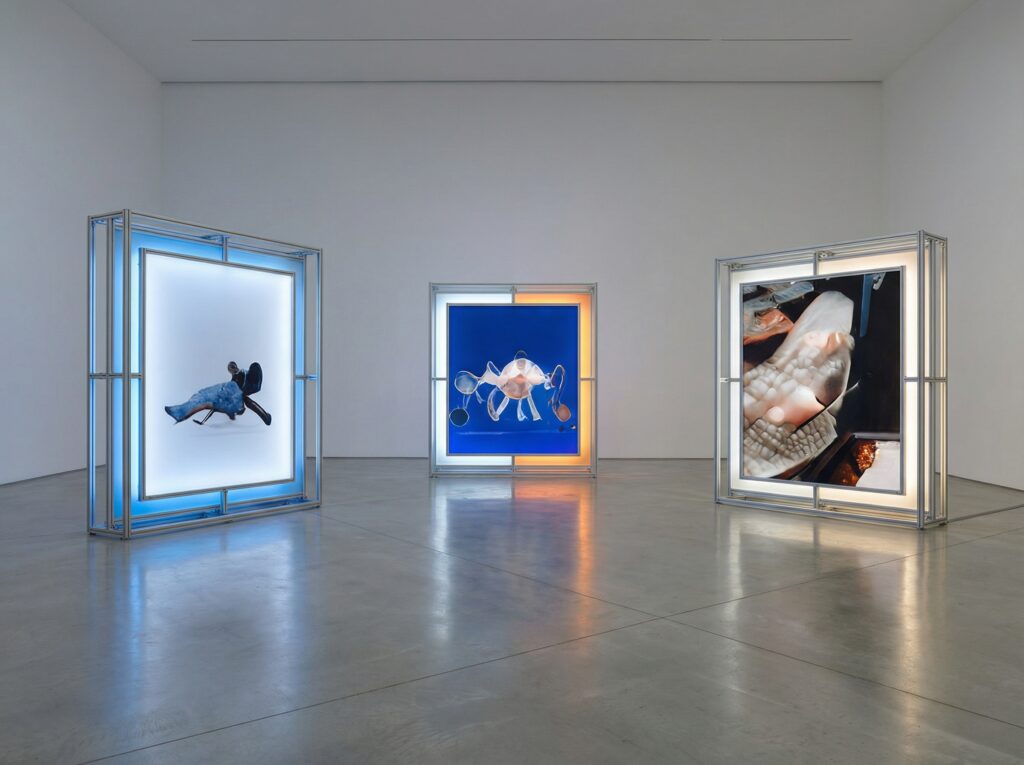 Cette œuvre explore les mutations perpétuelles rendues possibles par les technologies de l’intelligence artificielle. L’artiste utilise des algorithmes génératifs qui transforment des images collectées sur internet, créant un flux continu de métamorphoses visuelles où les frontières entre les formes naturelles et artificielles s’estompent.