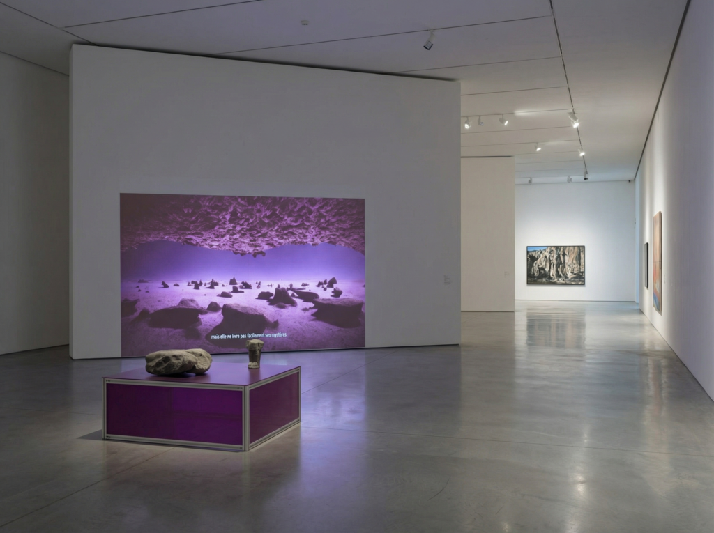 Un élément central de l’exposition est une photographie prise dans la Vallée des autruches, un lieu remarquable où coexistent les marques de l’érosion minérale, des dessins rupestres, et des décomptes de troupeaux gravés dans la pierre. Cette image témoigne éloquemment d’un continuum entre le travail incessant de la Terre et l’empreinte humaine, suggérant une forme de collaboration millénaire entre les forces naturelles et l’activité humaine.
