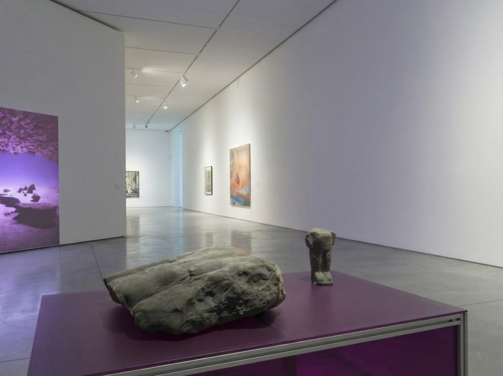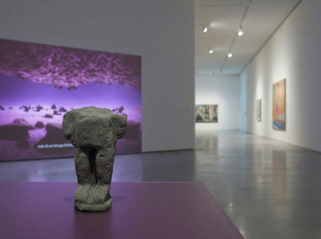 L’exposition se conclut par une installation sculpturale : deux sculptures préislamiques ont été fidèlement reproduites grâce à des techniques d’impression 3D utilisant du sable. Ces œuvres représentent des formes humaines fragmentaires, leur état incomplet pouvant être interprété de multiples façons. S’agit-il du résultat de processus naturels d’érosion, témoignant du passage inexorable du temps? Ou bien ces fragments sont-ils les vestiges d’actes d’iconoclasme, reflétant les tensions culturelles et religieuses qui ont façonné l’histoire de la région? Cette ambiguïté intentionnelle invite le spectateur à réfléchir sur la fragilité de l’art, de la mémoire, et de l’identité culturelle face aux forces conjuguées de la nature et de l’histoire humaine.